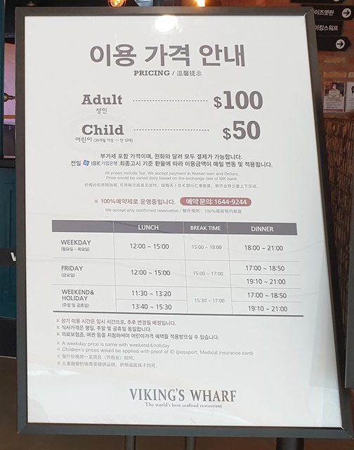 한번쯤 맛있는 랍스터를 먹어보고 싶다는 생각을 하고 있었다. 맛있는 음식을 소개하는 티비 프로그램을 보고 있으면 언젠가 한번 먹어봐야지 하는 그런 거였다. 인터넷으로 일단 검색을 해보니 랍스터 무한 리필 등 여러 식당 정보가 있었다. 그 중에서 바이킹스워프는 캐나다, 미국 등 현지에서 직접 공수한 랍스터를 무제한으로 먹을 수 있다고 표시되어 있었다. 가격도 미국 달러 US$ 100 을 지페로 결제가능했다. 유에스달러로 결제가능한 것도 재미잇고 맛있을 것 같은 생각에 전화로 확인해보았다. 무조건 예약이 필수라고 해서 가까운 바이킹스워프에 전화해서 예약했다.
