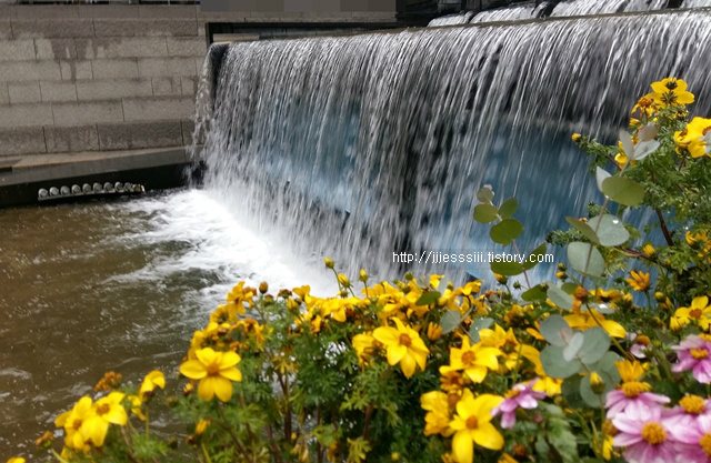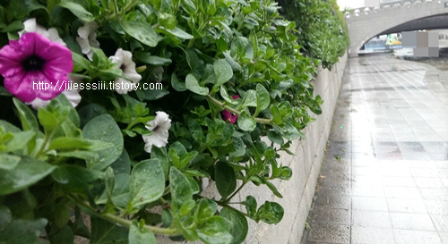 2019년 4월25일, 청계천을 방문하는 날 마침 비가 옵니다. 봄비,,,비는 주룩주룩 내리는데도 꽃은 아름답기만 합니다. 청계광장에서 청계천으로 들어가는 입구에 설치된 폭포는 바짝 가까이서 보니 생각보다 커보이고 물 떨어지는 소리도 엄청 커서 조금 놀랍니다.