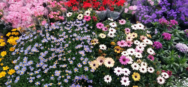 꽃 점포가 쭉 연결되어 있습니다. 꽃다발, 나무, 꽃송이 등등 있습니다.
