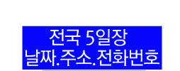 아래는 전국 5일장 날짜를 경기도.강원도.경상북도.전라남도 등 지역별 목록 입니다. 링크를 클릭하면 각 지역별 5일장 날짜를 볼 수 있으며, 아래부분에는 5일장별 전화번호를 볼 수 있는 지역별 목록 입니다.